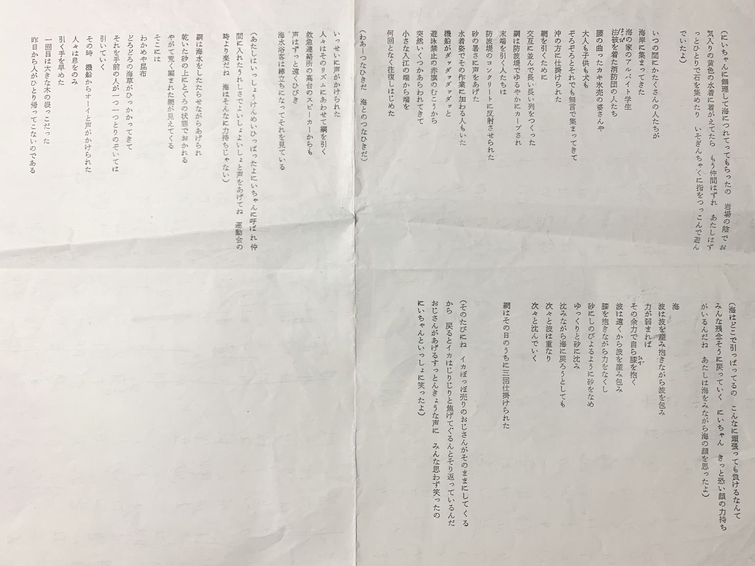 オープニングシーン:海辺のロングショット。村人総出で大声を掛け合いながら大網を引っ張っている。昨日、もぐり漁に行ったきり帰って来ない青年を皆で捜索しているのだ。喜一と両親が大粒の汗をかいて網を引っ張っているのを、小さな奈津はそばでニコニコ笑って応援している。焼きイカ売りのおじさんから焼きイカを買い網引きの合間にみんなで一緒に食べたりと、家族揃って過ごす時間が小さな奈津にとってはピクニックのような楽しいイベントに思えた。実際、それは最後の家族団欒となった。